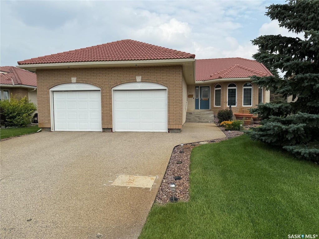 Excellent bungalow with a great location in Emerald Park, backing the 11th hole of the golf course and green space. This home has been very well kept with the main floor featuring nice open floor plan. Beautiful engineered hard wood floors run throughout the oak kitchen with center island, corner pantry, with granite counter tops, dining area, living room with gas fireplace, all bedrooms/den, and hallways. The large master bedroom has a huge ensuite with a walk-in shower, soaker tub, bathroom vanity, and a handy walk-in closet right in the ensuite. 2nd bedroom is a good size, and there is also a den, which does have a closet so could be used as a 3rd bedroom. The main floor does feature another 4-piece bath, a handy laundry room which leads to the double attached garage, and good-sized front foyer complete the main floor. The basement is finished with a large rec room, another bedroom, a 3-piece bath, and a large utility/storage area. Off the dining room, there is a garden door which leads to a large deck with extra storage bins under the deck, a patio area, and a great view of the golf course. The double attached 24’x24’ garage has 2 over head doors, and is insulated and drywalled, could easily be heated. This property is not a condo, it does have a Home Owners Agreement in place for all lawn maintenance, underground sprinklers (sprinklers are on well water, so no cost to the home), and snow removal which costs $200.00 per month. Great location, close to all the amenities that Emerald park has to offer. Call your realtor today to schedule a showing.